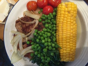 Place the corn on the cob in boiling water and cook, adding the peas and spinach 5 minutes before the end.