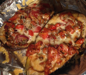 So this was the first time I had stuffed an aubergine but it certainly won’t be the last! This stuffed aubergine recipe is so easy to make and the bonus is you can use anything left laying about in your fridge (healthy of course)! This stuffed aubergine recipe is a great vegetarian recipes, but one which meat-eaters will also enjoy I’m sure!